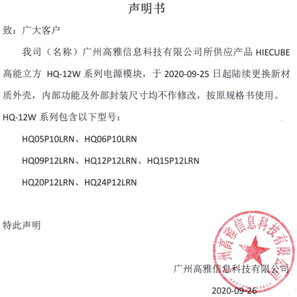 我司(名稱)廣州高雅信息科技有限公司所供應產品HIECUBE高能立方HQ-12W系列模塊電源,于2020-09-25日起陸續更換新材質外殼,內部功能及外部封裝尺寸均不作修改,按原規格書使用。