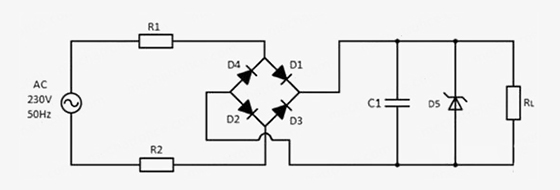 AC-DC電源電阻降壓電路拓撲如上所示,其中電阻R1是降低大部分輸入電源電壓的關(guān)鍵元件。現(xiàn)在要做的是計算R1的值以降低電壓,從而在特定電流值下獲得所需的負載兩端電壓。該電路首先通過R1分壓,之后通過橋式整流器將交流電轉(zhuǎn)換為直流電,然后是電容濾波和齊納穩(wěn)壓二極管進行穩(wěn)壓輸出。