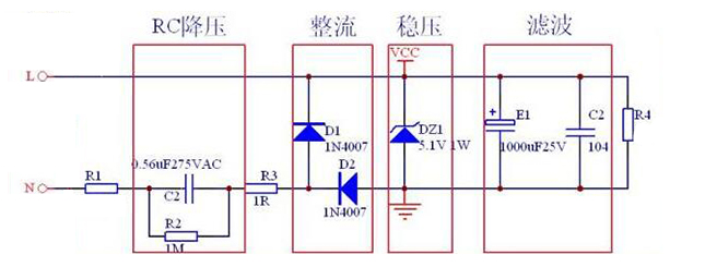 AC-DC電源阻容降壓電路由降壓-整流-穩(wěn)壓-濾波組成,在電路設(shè)計時,應(yīng)先確定負載最大工作電流,通過此電流值計算電容容值大小,從而選取電容。與線性變壓器電源的區(qū)別是阻容降壓電源是通過負載電流選定電容,而線性變壓器電源是通過負載電壓和功率選定變壓器。